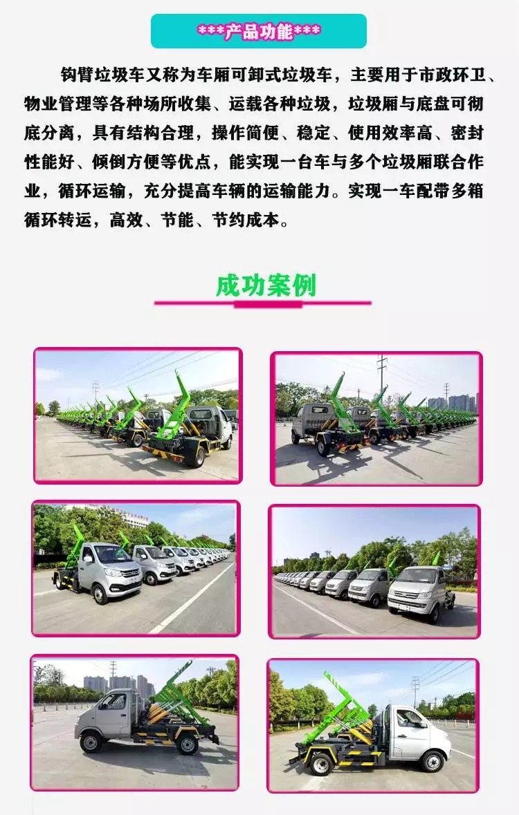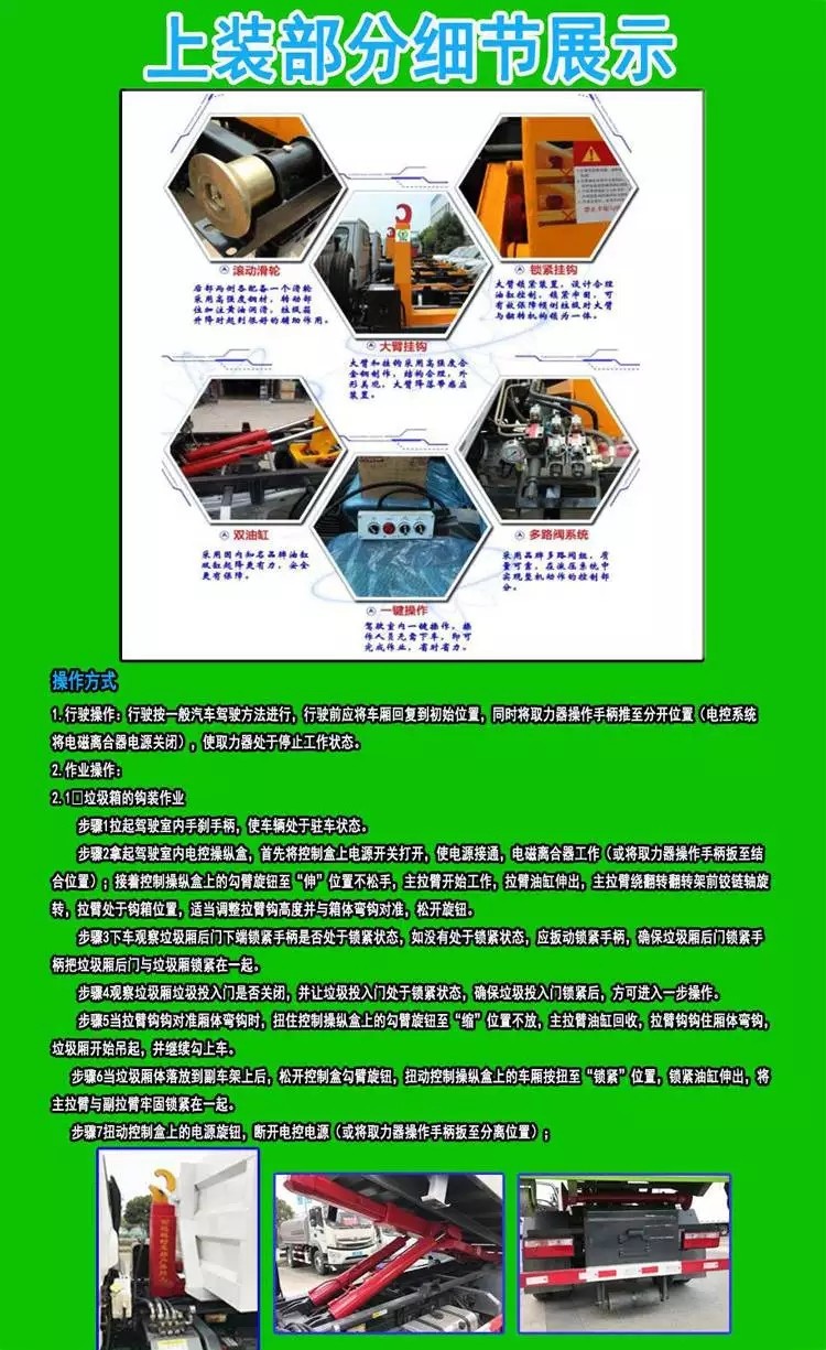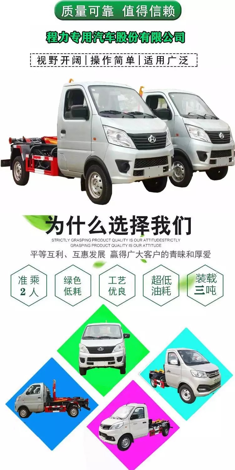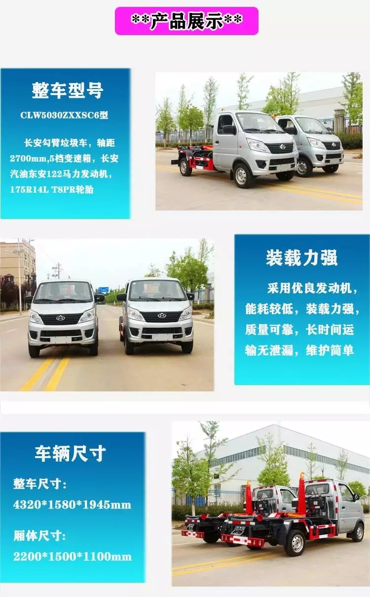 其主要特点:国六长安汽油蓝牌 2-3方 勾臂垃圾车 2700轴距,后单轮 ,勾臂采用强度钢材(德国钢号 S355MC 和S460MC)焊接而成,SOKEDY自主油缸,运动平稳、承载力强、密封性好、所有油缸均配有负载保持阀,垃圾箱压膜一次成型,烤漆,箱体防锈处理,①.双层加强型大臂立柱;②.采用国内知名品牌液压油缸;③.铸造型耐磨箱体托架;④.整体结构件大量采用精密铸造件;⑤一体化联动锁紧装置(国家专利产品)+安全限位装置;⑥.双向过滤型液压储油箱;⑦.高强度箱体导轮(镀锌防锈);⑧.手控电控一体化,操作简便;⑨.优质碳钢板垃圾箱体,自研模具冲压拼焊(国家专利垃圾箱产品!好的产品在于细节。